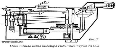Существуют жидкостные, механические и оптико-механические компенсаторы; наиболее часто применяются оптико-механические компенсаторы, в которых главным узлом является подвесное маятниковое устройство. На этом устройстве укреплены оптические детали или системы, предназначенные либо для изменения направления оси прибора либо для параллельного смещения этой оси. Непременной составной частью оптико-механического компенсатора является демпфер, предназначенный для гашения и ограничения собственных колебаний маятниковой подвесной системы. Приведем схему оптико-механического компенсатора, предназначенного для удержания в горизонтальном положении визирной оси трубы нивелира Ni007 (рис.9).