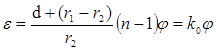 Угол ε`отклонение луча линзой при угле падения φ луча на линзу зависит от типа и параметров линзы. Для линзы типа менаска толщиной d, обращенного к падающему лучу выпуклой стороной, имеющему радиусы кривизны r1 и r2 и показатель преломления n: