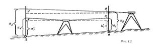 Углы ± α и ± β устанавливают при помощи подъемного винта, цена оборота которого определена в угловой мере на экзаменаторе. Перечисленная программа измерений составляет один прием. Для каждой длины визирного луча должно быть выполнено не менее 5 приемов. По вычисленным средним из пяти приемов превышениям