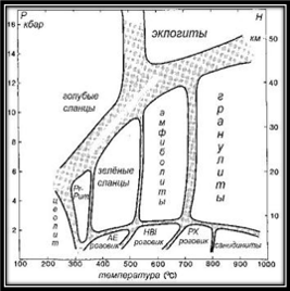 Как видно из схемы, для образования фаций зеленых сланцев характерна невысокая температура, малая глубина и относительно небольшое давление. Таким образом, можно утверждать, что зеленосланцевые фации относятся к дислокационному метаморфизму.