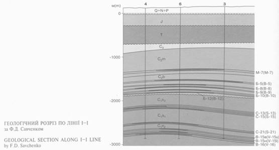 На описуваній території чітко простежуються три структурні поверхи: нижній - докембрійський фундамент, середній, складений могутньою товщею моноклинально залягаючих палеозойських і мезозойських порід, і верхній, представлений майже горизонтально залягаючими відкладеннями кайнозою, потужність яких в 10-20 разів менше потужності палеозойських і мезозойських відкладень.
