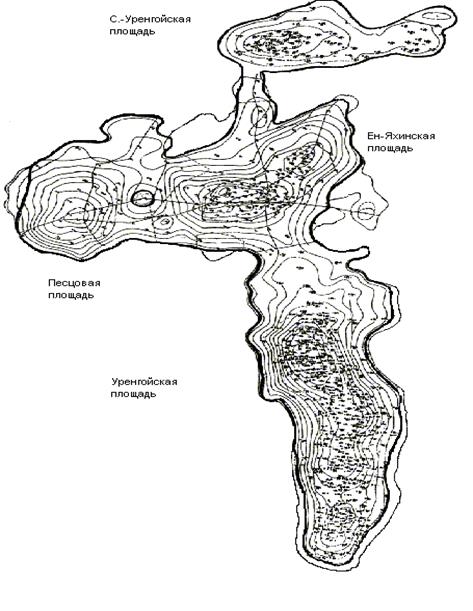 Уренгойская площадь. Приурочена к четко выраженной антиклинальной структуре субмеридианального простирания. Максимальная амплитуда поднятия составляет 225 м. Устанавливается 2 купола: – южный, в пределах южной переклинали (УКПГ-1АС) и основной, с максимумом поднятия в районе УКПГ-8. На севере площади установлено продолжение переклинального погружения структуры в северном направлении. Это погружение выделено в отдельный Таб-Яхинский участок. По новым данным бурения по сравнению с 1979 установлено наличие расширения перешейка между Уренгойской и Ен-Яхинской структурами, в отдельных местах расширение достигает 10 – 15 км.