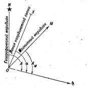 Угол между геодезическим меридианом данной точки и ее магнитным меридианом, направленным на север, называется склонением магнитной стрелки или магнитным склонением. Магнитное склонение считается положительным, если северный конец магнитной стрелки отклонен к востоку от геодезического меридиана (восточное склонение), и отрицательным, если он отклонен к западу (западное склонение). Зависимость между геодезическим азимутом, магнитным азимутом и магнитным склонением (рис.2) может быть выражена формулой: