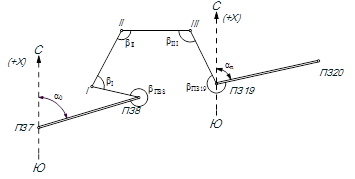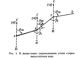 Дирекционные углы вычисляют по правилу: дирекционный угол последующей стороны равен дирекционному углу предыдущей стороны плюс 180° и минус горизонтальный угол, справа по ходу лежащий. Следовательно,