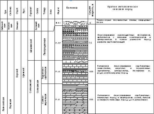 Соленосные отложения Соликамской впадины приурочены к иренскому горизонту кунгурского яруса нижней перми. Надсолевые терригенно-карбонатные породы относятся к уфимскому ярусу верхнего отдела пермской системы; на рассматриваемой территории они перекрыты только кайнозойскими отложениями.