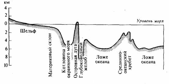 В наиболее типичном виде переходные зоны, таким образом, представлены в виде комплексов трех крупных элементов рельефа: котловин окраинных глубоководных морей; горных систем, отгораживающих котловины от океана и увенчанных островами, островных дуг; узких желобообразных впадин, расположенных обычно с внешней стороны островных дуг, – глубоководных желобов. Такое закономерное сочетание перечисленных элементов явно указывает на их единство и генетическую взаимосвязь. В строении некоторых переходных зон имеются заметные отклонения от этой типичной схемы.