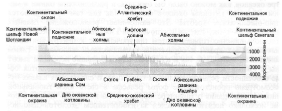 Рис.3 Основные морфогенетические элементы рельефа северной части Атлантического океана на профиле от Северной Америки до Африки. [3]