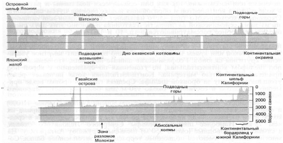 Рис.4 Основные морфологические элементы рельефа дна северной части Тихого океана на профиле от Японии до Калифорнии. [3]