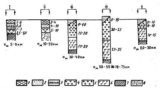 Рис. 5 I— океанская кора (ложе океана); II— субокеанская кора (впадины окраинных и внутренних морей); III— континентальная кора платформ; IV— континентальная кораорогенных поясов; V— субконтинентальная кора (островные дуги); 1— слой воды, 2— осадочный слой, 3— второй слой океанской коры, 4— третий слой океанской коры, 5— «гранитный» (гранитометаморфический) слой континентальной коры; 6— «базальтовый» (гранулито-базитовый) слой континентальной коры, 7— нормальная мантия, 8— разуплотненная мантия. [3]