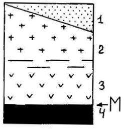 Рис. 6 Схема строения континентальной коры, слои: 1 – осадочный, 2 – гранитно-метаморфический, 3 – гранулито-базитовый, 4 – перидотиты верхней мантии.