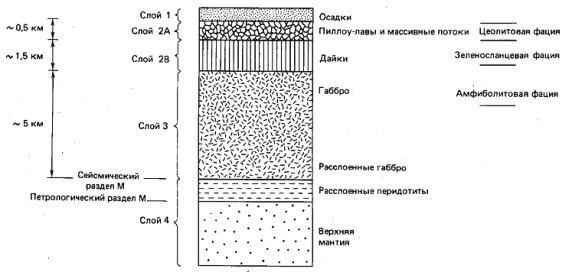 По материалам бурения и сейсмическим данным земная кора океанического типа в общем виде характеризуется следующим строением. В настоящее время выделяют 4 слоя которые резко различаются по скорости продольных волн. Верхний (1) слой – осадочная толща(рыхлые отложения), мощность 0,5 км , сейсмическая скорость которой 1,5-2 км/с. Ниже прослеживается второй (2) слой(вулканогенный базальтовый) V= 2,1-6 км/с- средняя 5 км/с. Бурением установлено что верх этого слоя (2А) во всех скважинах сложен подушечными лавами - толеитовыми базальтами, являющиеся фундаментом для осадков. При сейсмопрофилировании его называют слой B. Еще ниже в слое 2Б (V=4,6 км/с) залегают габброиды. Драгирование естественных отложений на дне показало, что верхняя часть слоя 2 сложена, как было выше сказано, шаровыми лавами и лавобрекчиями (2А), нижняя - базальтами с многочисленными дайками и силами долеритов. Далее залегает сейсмический слой 3 – «океанский» V=6,4-7,4 км/с мощностью 4,7 км. Он состоит в основном из ультраосновных пород. Слой 4 – мантия со скоростями распространения 8-8,2 км/с, в которой преобладают ультраосновные и метаморфические породы .