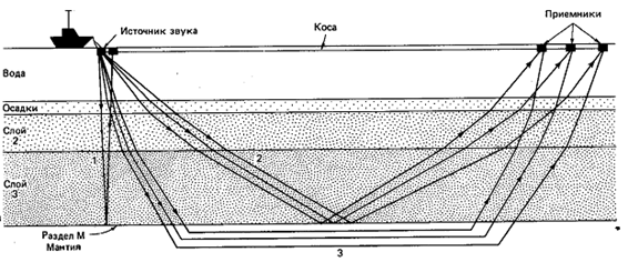 Сейсмопрофилирование позволяет картировать акустические отражающие горизонты в толще осадков. Работают волны обычно на частотах от 20 до 200 Гц. Низкочастотные акустические сигналы, проходя через осадки, ослабляются (поглощаются) меньше, чем высокочастотные, и поэтому частично проникают сквозь поверхность дна, отражаясь от подповерхностных границ раздела. Отраженные волны наблюдают при совмещении точек возбуждения и приема колебаний (способ центрового луча) или при сравнительно небольшом расстоянии между этими точками.