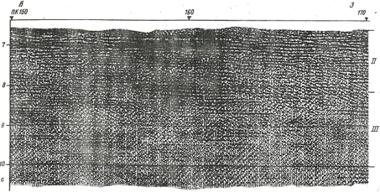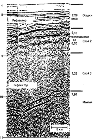 Рис. 21 Сейсмический разрез глубоководной котловины по данным ГСП-МОВ. Видна дискретность отражающих границ консолидированной океанической коры. II,III – номера слоев коры.[7]