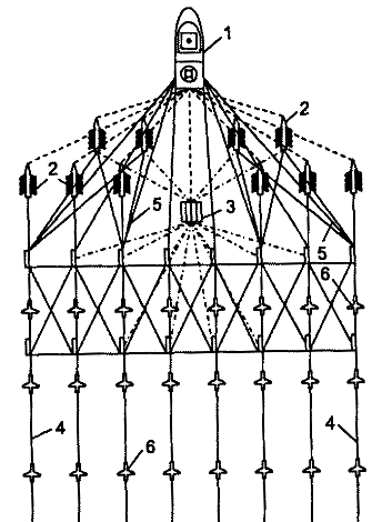 Рис.15 Судно, оборудованное для морских исследований. На большой лебедке, укрепленной на кормовой палубе, намотана сейсмическая коса длиной 3—4 км; остальная часть палубы занята компрессорами, подающими сжатый воздух в пневмопушки. Закрытая часть на уровне этой палубы содержит мастерские, лаборатории и камбуз; на уровне верхней палубы находятся кают-компании и каюты для персонала экспедиции. Имеются разнообразные антенны для спутников и радионавигации, связи с берегом и радиобуями и т. д. Судно может оставаться в море примерно в течение месяца. [4]