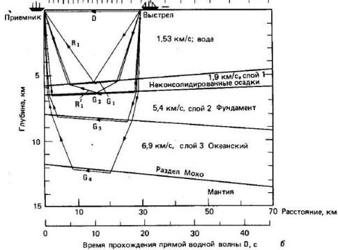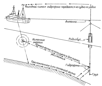 В двухсудовом варианте одно (приемное) судно стоит на месте, а другое удаляется от него, производя взрывы через определенные промежутки времени. Мощность источника по мере удаления увеличиваются. В большинстве таких экспериментов максимальное удаление судов достигало 100 км. Волны, поступающие от самых глубоких слоев, регистрируются первыми, так как они движутся с наибольшей скоростью. Ввиду дороговизны и сложности двухсудового метода был разработан односудовой вариант с использованием для регистрации автономных радиобуев. К радиобую подвешивается один заменяемый гидрофон, опущенный на глубину от 20 до 40 м от поверхности воды. Радиобуй, энергопитание которого обеспечивается батареей, действующей за счет реакции с морской водой, передает на судно принятые гидрофоном сигналы. Судно, удаляясь от буя, производит «выстрелы» айрганом. В начале работ буй размещают от судна на расстоянии, достаточном для приема прямых и преломленных волн, идущих под большими углами. Радиобуй, таким образом, действует как принимающее судно в двухсудовом варианте. Полученные данные позволяют рассчитать распределение сейсмических скоростей по глубине в толще осадков, скорости преломленных волн и их градиенты. В конце 60-х и начале 70-х гг. в сейсмическую методику было внесено два существенных усовершенствования, позволившие уточнить наши представления об океанической земной коре: айрганы, производящие не одиночные, а многократные возбуждения, и донные сейсмографы. Донные сейсмографы разных типов служат для приема сейсмических сигналов, посылаемых с надводного судна. Они опускаются на дно путем свободного падения. Всплытие обеспечивается с помощью либо реле времени, либо акустического размыкателя. Для регистрации сейсмических сигналов внутрь корпуса сейсмографа помещают приемное устройство и магнитофон. Важнейшими преимуществами донных сейсмографов являются строгая фиксация точки приема и прием в условиях тишины. В результате зондирования методом преломленных волн к началу 60-х гг. были выявлены основные черты строения океанической земной коры. Установлено, что кора над мантией состоит из трех основных слоев, характеризующихся следующими средними величинами сейсмических скоростей: