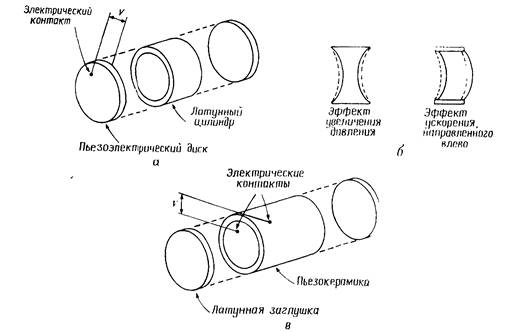 Электрическая цепь выполнена так, что если обе пластины прогибаются внутрь, реагируя на увеличение давления со стороны внешней среды, то возникающие напряжения складываются, а если они изгибаются в одном и том же направлении, реагируя на ускорение, они взаимно уничтожаются (рис. 18,6). Эта особенность носит название гашение ускорений. Основными элементами цилиндрических гидрофонов (рис. 18, в) являются тонкие полые цилиндры пьезоэлектрической керамики, закрытые на концах латунными заглушками.