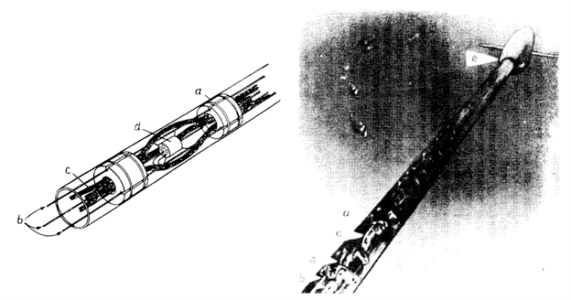 Рис.20 Схема и фотография сейсмической косы. Пластмассовые разделители а соединены тремя эластичными проводами b; связка электрических проводов с проходит сквозь отверстия разделителей. Гидрофон помечен буквой d. Сейсмическая коса помещается в мягкую пластмассовую оболочку, наполненную жидкостью, которая обеспечивает косе нейтральную плавучесть. Устройства для регулировки глубины погружения (е) закреплены на косе.[4]