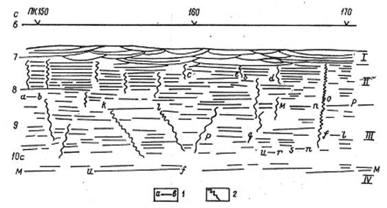 Рис.22 Результаты интерпретации сейсмического разреза, приведенного на рис. 1- дискретные отражающие границы; 2- зоны нарушений. I-IV – структурные толщи; М- граница Мохоровичича. [7]