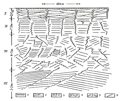 Рис. 23 Обобщенная модель структуры земной коры океанических котловин. 1- поверхность дна океана; 2-5-толщи: 2-линзо-блоковая, 3-сейсмически «прозрачная» с вертикальными нарушениями; 4-блоковая с субвертикальными и наклонными зонами нарушений; 5- блоковая с наклонными зонами нарушений; 6- зоны нарушений.
