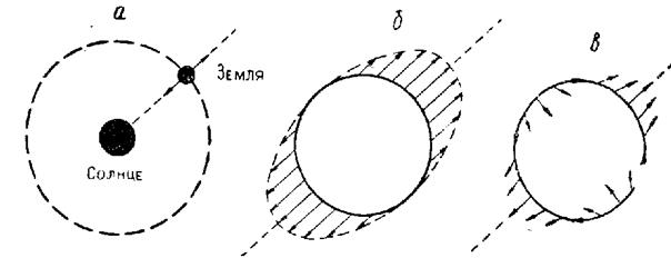 Рис. 3. Схемы гравитационно-ннерционного растяжения Земли вдоль оси Солнце — Земля (а), распределения приливообразующих сил на сферической недеформируемой Земле (б) и перемещении материальных точек поверхности Земли под действием приливообразующих сил (в).