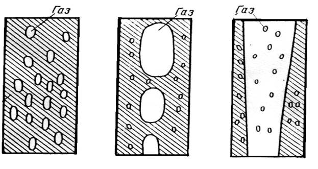 1) режим піни (Мал. 1а), при якому бульбашки газу більш або менш рівномірно розподілені в потоці нафти;
