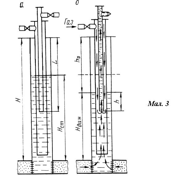 Газовий або повітряний підйомник (Мал. 3) складається із двох каналів (трубопроводів), один з яких служить для подачі робочого агента, а другий – для підйому рідини. Тобто в свердловину спускають два ряди НКТ. При нагнітанні по повітряним трубам газ або повітря витіснивши із них нафту до башмака НКТ, почне надходити в труби, перемішуючись у вигляді бульбашок з нафтою і знижувати її густину. Чим більше повітряні труби, тим менше буде густина нафтової суміші і тим на більшу висоту підніматися ця суміш. Висота підйому нафто - повітряної або нафтогазової суміші в підйомних трубах залежить від кількості нагнітаємого повітря або газу, глибини занурення труб під статичний рівень, їх діаметра та в’язкості нафти.