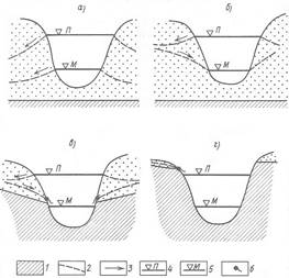 Схема взаимодействия речных и грунтовых вод: а - постоянная односторонняя гидравлическая связь, б - постоянная двусторонняя гидравлическая связь, в - временная гидравлическая связь, г - отсутствие гидравлической связи. 1 - водоупорный пласт, 2 - уровень грунтовых вод, 3 - направление движения грунтовых вод, 4 - уровень воды в реке в половодье, 5 - уровень воды в реке в межень, 6 - источники (родники). |
