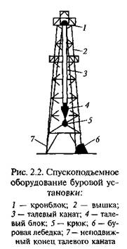 Процесс бурения сопровождается спуском и подъемом бурильной колонны в скважину, а также поддержанием ее на весу. Масса инструмента, с которой приходится при этом оперировать, достигает многих сотен килоньютонов. Для того чтобы уменьшить нагрузку на канат и снизить установочную мощность двигателей применяют подъемное оборудование (рис. 2.2), состоящее из вышки, буровой лебедки и талевой (полиспастовой) системы. Талевая система, в свою очередь, состоит из неподвижной части — кронблока (неподвижные блоки полиспаста), устанавливаемого наверху фонаря вышки, и подвижной части — талевого блока (подвижного блока полиспаста), талевого каната, крюка и штропов. Подъемное оборудование является неотъемлемой частью всякой буровой установки независимо от способа бурения.