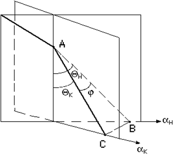 Следует отметить, что интенсивность азимутального искривления существенно зависит от зенитного угла скважины и при малых зенитных углах может достигать весьма значительных величин, а это не дает полного представления о положении скважины. Для оценки общего искривления служит угол пространственного искривления j, показанный на рис. 2. В случае, если бы скважина, имеющая в точке А зенитный угол Qн и азимут aн , не искривлялась, то забой ее оказался бы в точке В, но за счет искривления фактически забой оказался в точке С, зенитный угол стал равным Qк , а азимут aк . Угол ВАС и является углом пространственного искривления. Величина его аналитически определяется по формуле