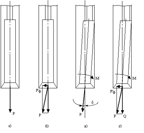 Во втором случае действуют объективные причины, связанные с неравномерным разрушением породы на забое скважины. Каждая из этих причин проявляется в виде сил и опрокидывающих моментов, действующих на породоразрушающий инструмент. Все эти силы и моменты могут быть приведены к одной равнодействующей и главному моменту. При этом возможны четыре случая.