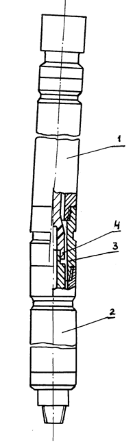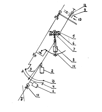 Арретирование магнитной стрелки и отвеса и переключение датчиков на измерение зенитного угла или азимута производится переключающим механизмом, который приводится в действие электромагнитом, находящимся в глубинном приборе и управляемым с поверхности. В процессе спуска и подъема глубинного прибора стрелка отвеса и магнитная стрелка дугами 13 и 14 прижаты к реохордам. При остановке для замера параметров искривления они освобождаются, выдерживаются некоторое время для успокоения, затем вновь прижимаются к реохордам и производится поочередное измерение зенитного угла и азимута путем измерения величины сопротивления реохордов от начала до соответствующей стрелки.
