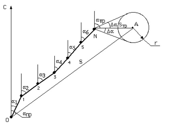 Построение горизонтальной проекции ведется следующим образом. Через точку О, принятую за устье скважины (рис. 7), проводится направление на север. От этого направления откладывается проектный азимут скважины aпр и отрезок ОА, равный в принятом масштабе проектному отходу (смещению) S. Далее через точку О проводится линия под углом a1 ср , равным среднему значению азимута скважины на первом участке, и по ней откладывается в принятом масштабе горизонтальная проекция участка ствола S1 , определенная по формуле (7). Через полученную точку 1 под углом a2 ср к направлению на север проводится линия, по которой откладывается отрезок S2 в том же масштабе, и т. д. до точки N, являющемся забоем скважины.