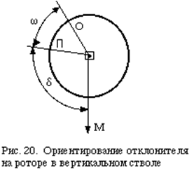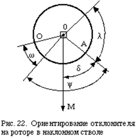 Ориентирование отклонителя в скважине практически производится следующим образом. Предварительно определяется значение вспомогательного угла d по формуле