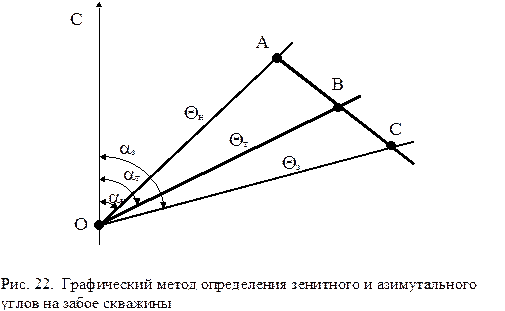 Значение этого угла jз в принятом линейном масштабе откладывается по направлению АВ от точки А. Полученная точка С соединяется с точкой О, после чего определяются зенитный угол Qз и азимут aз на забое скважины.