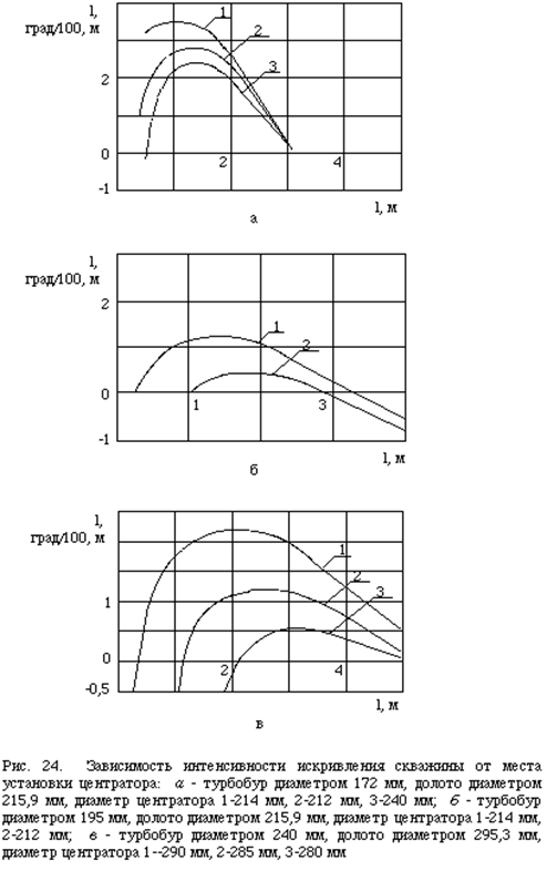 Стабилизация, уменьшение или увеличение зенитного угла наклонно направленных скважин достигается установкой в КНБК центратора на соответствующем расстоянии от торца долота. На рис. 23 показаны теоретические зависимости интенсивности искривления от этого расстояния для различных диаметров долот, турбобуров и центраторов [4]. Анализ приведенных графиков показывает, что общие тенденции искривления скважин для различных случаев сохраняются. При малом расстоянии до центратора интенсивность искривления близка к 0, затем возрастает до некоторого максимума, а затем снижается. Следует отметить существенное влияние диаметра центратора. При его уменьшении даже на 2 мм интенсивность искривления снижается в некоторых случаях в 2 раза.