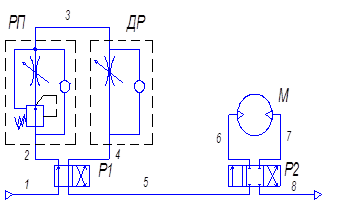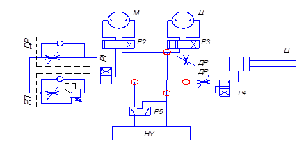 Перед составлением схемы необходимо выбрать способ регулирования скорости выходных звеньев гидродвигателей. В курсовой работе используется дроссельный способ управления, заключающийся в создании гидравлического сопротивления потоку жидкости, путем изменения проходного сечения.