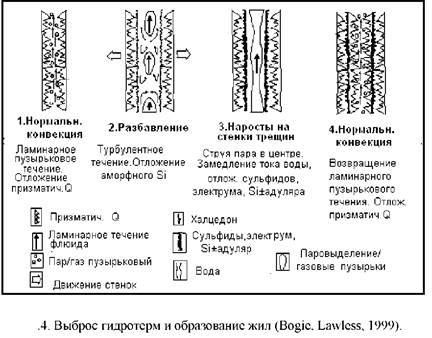 Тепло вмещающих пород будет способствовать такой кристаллизации. Этот процесс наблюдается на геотермальных трубопроводах. Во время дальнейших выбросов, которые обусловлены теплоотдачей вмещающих пород, более аморфный кремнезём отлагается вместе с редким адуляром и непрозрачными минералами. Кроме этого, быстрая кристаллизация аморфного кремнезёма необходима, чтобы увеличить механическое упрочение и это, возможно, происходит при наличии других минералов, благоприятствующих кристаллизации очень тонкозернистого кварца, а не халцедона. Поздний призматический кварц отлагается непосредственно во время возврата нормальной конвекции. Если полосы имеют ненарушенные границы, то здесь находились открытое пространство и непрерывный поток гидротерм на протяжении всего цикла, и полосы наиболее часто наблюдаются в раздувах жил. Полосы жильной брекчии могут встречаться обычно на границах жил, но они также могут располагаться вблизи и в центре жил, что свидетельствует о закупорке в сужениях перед расширением разлома. Главными событиями отложения золота, которые наиболее благоприятствуют этому процессу, это наличие больших объёмов гидротерм и их кипение в разломах. Для этого необходимо наличие горизонтальных сужений и расширений в разломах, где происходит образование жил и закупорка сужений для того, чтобы создать напор в гидротермальном потоке. В другом варианте любое открытие разлома может быть слишком медленным, а постепенность этого процесса не обеспечит большой перепад давлений, с которым может быть связано последующее отложение золота. Если открытие разлома слишком значительное, то большой перепад давлений, возникающий в этом случае, по-видимому, может способствовать притоку новых порций гидротерм во время кипения, уже имеющихся в полости разлома, что не может благоприятствовать интенсивному отложению золота. Это согласуется с наличием руд с высокими концентрациями золота в тонких полосах эпитермальных жил.