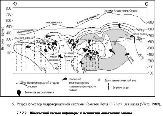 Эти месторождения известны также в качестве кварц-серицитовых. Примером этого типа месторождений является Комсток Лоуд в Неваде (рис.5). Рудоносные гидротермы почти нейтральные, более минерализованы и в среднем более высокотемпературные (200-2600 С), чем в месторождениях восходящих потоков.