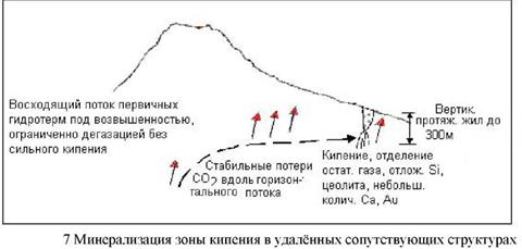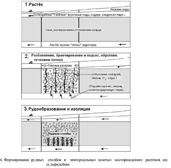 В системах, в которых растёк распространялся за счет разбавления, он обычно стратифицирован, и золото содержащий флюид мог дренироваться под районом с высоким рельефом и под выше расположенным водоносным горизонтом, и восходить к дневной поверхности. Происходит декомпрессия и отложение золота в результате кипения (Lawlessetal., 1995). Эти месторождения имеют такие же особенности, что и месторождения восходящих потоков, описанные ранее, но для них характерно низкое содержание газов, о чём свидетельствуют цеолиты (или их псевдоморфозы), очень низкие содержания сульфидов. В среднем для них характерны низкие температуры отложения минералов. Поскольку гидрогеологическая структура такой системы характеризуется наличием маломощного латерального высокотемпературного водоносного горизонта, то такие месторождения не имеют большого вертикального распространения (рис.7). Следовательно, корректная идентификация их на ранней стадии разведки является решающим фактором в оценке их экономического потенциала.