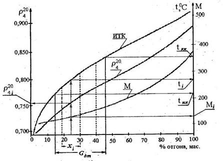 Пользуясь, кривой истинных температур кипения (ИТК) сырья, устанавливают выходы продуктов перегонки в процентах на сырье исходя из выбранных пределов выкипания фракций. На рисунке 3 представлен пример установления выходов фракций и их показатели качества. После этого составляется материальный баланс установки в виде таблицы 2 [1].