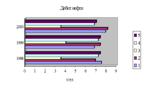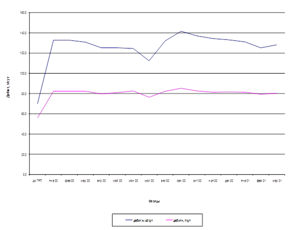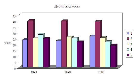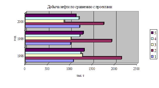 1006,0 тыс. т. Необходимо отметить, что начиная с 1999 года, были начаты работы направленные на повышение добычи нефти, в том числе и за счет запуска простаивающего фонда, так в 2000 году действующий добывающий фонд составил 466 скважин, против 423 в 1999 году. Проведенный комплекс мероприятий позволил нарастить добычу нефти 2000 года относительно 1999 года и выйти на показатели разработки 1996 года (1210 тыс. т в 2000 и 1250 в 1996 году). Компенсация отбора закачкой изначально превышала единицу и на 1.01.2001 г. текущая компенсация составляет 153 %, накопленная 137%.