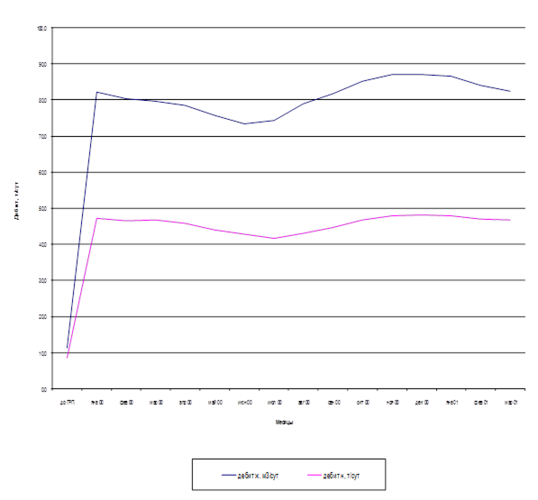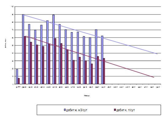 При высоком базовом дебите нефти (более 40 т/сут) – эффективность самая низкая по сравнению с остальными скважинами. Это выражается большим увеличением добычи жидкости, с незначительным приростом добычи нефти (в 1,5 раза против 2,5 – 6 раз).