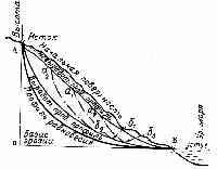 Соотношение донной и боковой эрозии изменяется на разных стадиях развития долины реки. В начальных стадиях развития реки преобладает донная эрозия, которая стремится выработать профиль равновесия применительно к базису эрозии - уровню бассейна, куда она впадает. Базис эрозии определяет развитие всей речной системы - главной реки с ее притоками разных порядков. Первоначальный профиль, на котором закладывается река, обычно характеризуется различными неровностями, созданными до образования долины. Такие неровности могут быть обусловлены различными факторами: наличием выходов в русле реки неоднородных по устойчивости горных пород (литологический фактор); озера на пути движения реки (климатический фактор); структурные формы - различные складки, разрывы, их сочетание (тектонический фактор) и другие формы. В процессе регрессивной эрозии река, углубляя свое русло, стремится преодолеть различные неровности, которые со временем сглаживаются, и постепенно вырабатывается более плавная (вогнутая) кривая, или профиль равновесия реки (рис. 6.4). Считается, что этот выровненный профиль соответствует на каждом отрезке долины динамическому равновесию при данных гидрологических условиях и постоянном базисе эрозии.