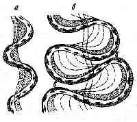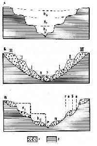 В накоплении аллювия и в формировании речных долин большую роль играют указанные выше изгибы рек, возникающие главным образом в результате турбулентного характера течения потока, когда поступательные движения воды сочетаются с поперечной циркуляцией. Но изгибы могут возникать и при наличии различных неровностей рельефа. Двигаясь по дуге изгиба, вода испытывает воздействие центробежной силы, и стрежень потока прижимается к вогнутому берегу, где вода опускается вниз, вызывая усиленный размыв дна, борта русла и захват обломочного материала. От подмываемого крутого берега придонные токи воды направляются к противоположному выпуклому берегу, где начинается интенсивная аккумуляция и образуется так называемая прирусловая отмель, частично обнажающаяся при спаде воды во время межени. Это начальный этап формирования аллювия (рис. 6.6, А).