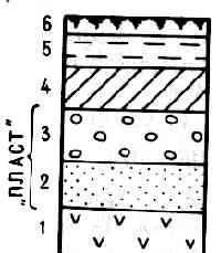 Россыпи в пойме и в речных террасах часто выражены в виде полосовидных залежей нижней части разреза аллювия. Схематический разрез аллювиальной долинной россыпи представлен на рис. 6.13, где снизу вверх залегают: 1) коренные породы, называемые "плотиком"; 2) элювиальный слой, перемытый и залегающий на месте образования (пески); 3) аллювиальные отложения галечников, иногда включающие валуны; 4) аллювиальные глины и песок ("торфа"); 5) коллювиальные и пролювиальные илы и глины, иногда со щебнем, местами со щебнистыми прослоями; 6) почвенно-растительный слой. Тяжелые минералы содержатся преимущественно в плотике, в его элювии и в галечниках. Они вместе образуют так называемый "пласт" россыпи. Иногда наблюдаются сложные россыпи, содержащие два или несколько горизонтов металлоносных отложений, расположенных на различных уровнях. Особенно большое практическое значение имеют россыпные месторождения драгоценных металлов - золота и платины. В настоящее время около 25% мировой добычи золота производится из россыпей. Но помимо россыпных месторождений, связанных с современными долинами рек, в ряде мест обнаружены ископаемые россыпи, формировавшиеся в различные этапы геологического времени, когда существовали континентальные условия и развивались речные системы. Эти россыпи отличаются от более молодых залеганием на большей глубине в толще других пород и сцементированностью. Они обычно представлены конгломератами. Классическим примером таких ископаемых россыпей являются золотоносные конгломераты Витватерсранда в Ю. Африке, где среднее содержание золота достигает 8 г/т и ивестны его большие суммарные запасы.