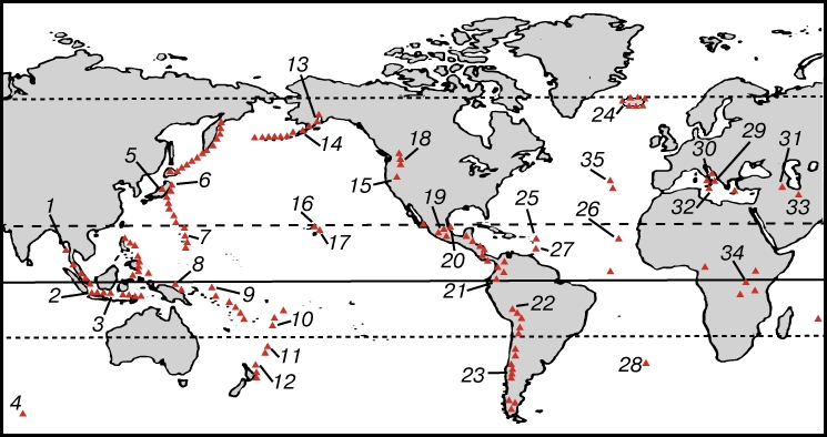 ДЕЙСТВУЮЩИЕ ВУЛКАНЫ ЗЕМЛИ Действующим считается вулкан, извергавшийся в историческое время. Всего известно примерно 2500 извержений 500 таких вулканов. На карте отмечены некоторые наиболее известные, а также упомянутые в тексте вулканы.