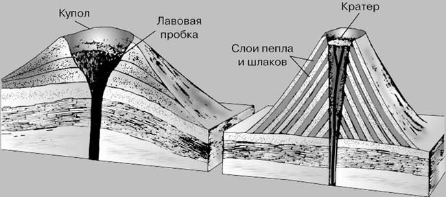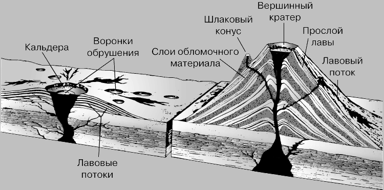 ЩИТОВОЙ ВУЛКАН (слева) с большим кратером (кальдерой), и тонким покровом застывшей лавы на поверхности. Излияния лавы могут происходить из кратера на вершине или через трещины на склонах. Внутри кальдеры, а также на склонах щитового вулкана встречаются воронки обрушения. КОНУС СТРАТОВУЛКАНА (справа) состоит из чередующихся слоев лавы, пепла, шлаков и более крупных обломков. На склоне вулкана показан шлаковый конус.