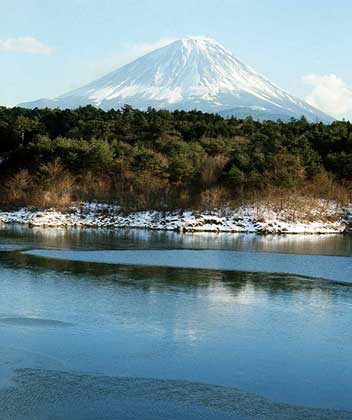 ВЕЛИЧАЙШАЯ ГОРА ЯПОНИИ ФУДЗИЯМА (3776 м над у.м.) - конус "спящего" с 1708 вулкана, покрытый снегом в течение большей части года.
