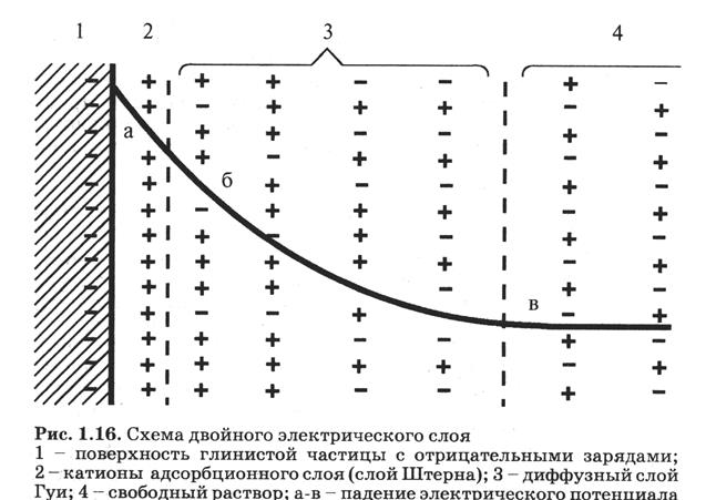 В объеме, занимаемом пленочной водой, расположен двойной электрический слой (ДЭС) (рис. 1.16), возникающий близ границы твердой и жидкой фаз благодаря тому, что поверхность твердой фазы имеет электрический заряд, обычно отрицательный.