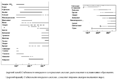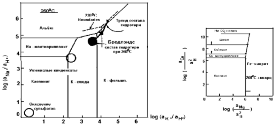 Аналогично фазовые диаграммы могут быть построены для Са и Mg, содержащиеся в минералах. Напротив, гидротермы современных систем располагаются вблизи хлоритов, цоизитов и цеолитового равновесий, что согласуется с наблюдёнными минеральными комплексами.